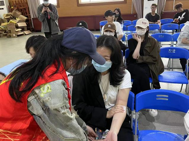 献血结束后,同学们在志愿者的陪同下在休息区进行留观调整,大家在休息之余脸上都充满了无偿献血后的自豪与温暖,公司与公司更是贴心地为大家准备了补给礼品、营养品,这份守护生命、为爱助力的感动,在所有人心中传递。