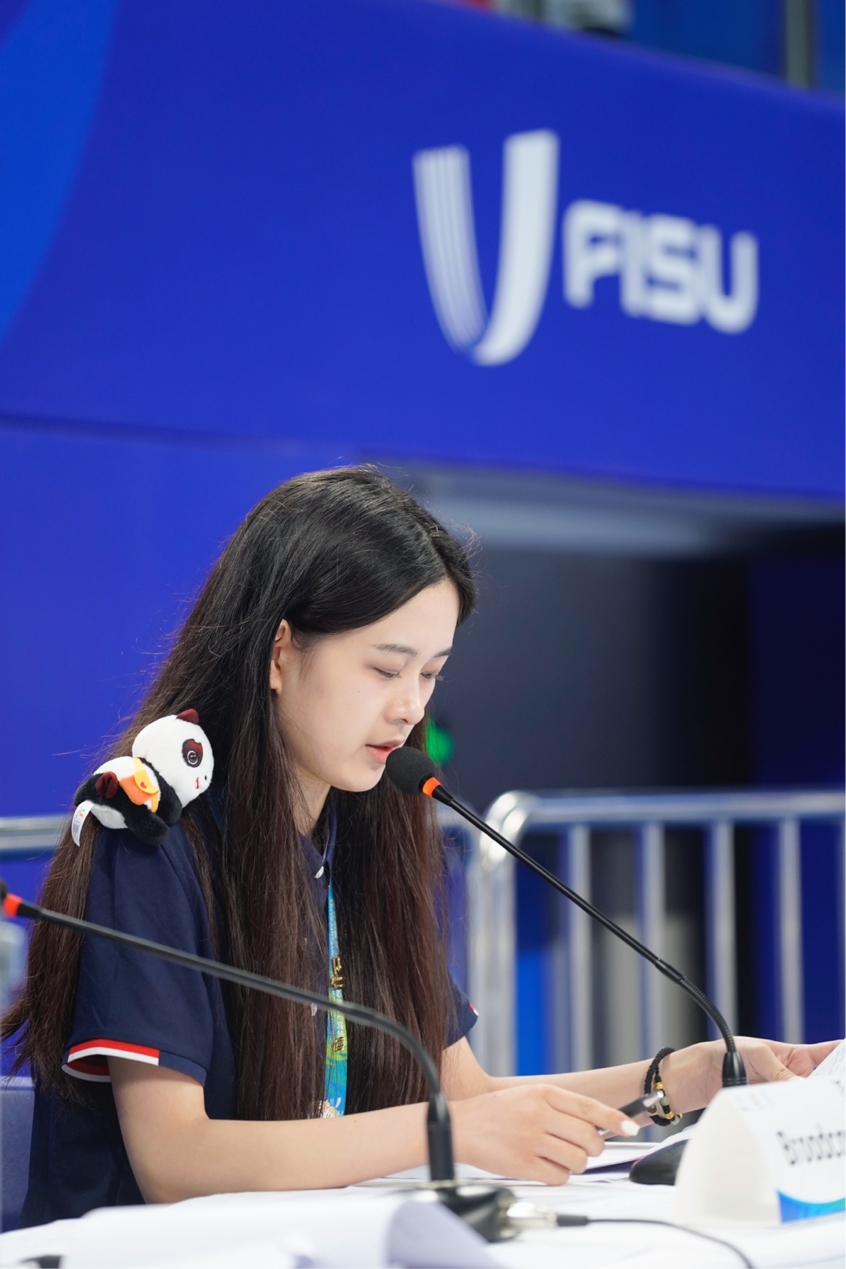 2017级播音专业的陈博媛主要参与了排球项目的解说共9场,其中包括了女排金牌赛,从赛事过程中精准、专业的技战术解读与分析,到对解说节奏的完美把控,以及最后中国队夺冠后的全面总结,都体现了一个专业的体育解说员所具备的素质和能力,堪称一场“教科书”级别的解说。陈博媛提到,由于老员工运动员的资料信息很匮乏,自己在解说中最困难的就是在查找运动员资料、摸清队伍特点中耗费了大量时间精力,也应对了当天下午临时加场和转播场馆单机位的解说难题,但她都选择了迎难而上,并完成了一场又一场精彩的排球赛事解说。同样参与排球项目解说的还有2019级播音专业的张诚语、2020级播音专业的范贵懿,张诚语参与的解说共6场15小时,除此之外,他也是2022-2023中国排球超级联赛的解说主力之一,参与解说32场共96小时,随着比赛的大量练习他的解说经验快速增长,加上在排球领域多年的砥砺深耕让他的解说有了深度、广度、流畅度,其专业性更是收获了球迷们的高度肯定。范贵懿同样也是2022-2023中国排球超级联赛的主力军之一,共解说比赛三十余场,其中包括5到8名排位赛、第三第四名排位赛等重点比赛场次,解说时长近百小时,良好的工作态度和较好的业务能力收获了广大网友和工作人员的一致好评,除此之外,她也担任了水球项目的解说以及大运会体操项目英文播报员,从体操项目赛台训练开始,完成赛事播报18场,颁奖仪式播报14场,工作能力和面对突发情况的反应能力获得了国际大体联代理主席雷诺·艾德先生高度评价,正是一次次的实战磨炼,让他们在大赛中不断进步成长。