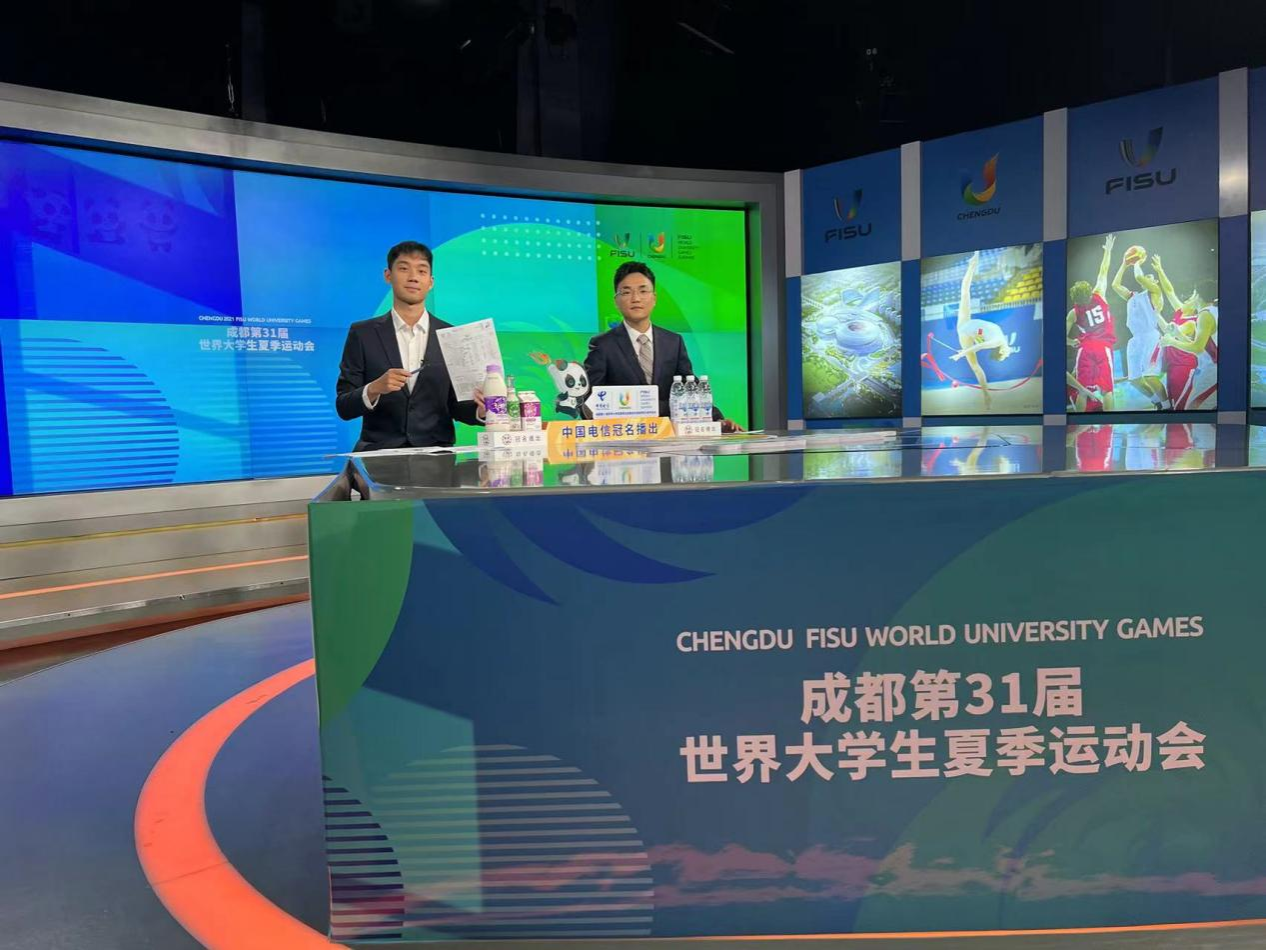 成都电视台成立的大运会主场解说团队由韩乔生、洪钢、刘宁等老牌解说员领衔,来自402永利集团2020级新闻学专业的研究生刘沛元(大运会解说员全国招募活动冠军)、2021级播音专业的宋怡辰(腾讯女主播冠军)均被委以重任,在成都电视台转播间深度参与了篮球、田径、游泳、水球、射击等项目的解说工作中。结束了每天的解说工作之后,他们都要马不停蹄地查询第二天的解说安排并做好充分的资料准备,因为每一天的赛程解说安排,一般会在晚间10点左右通知,所以常常要熬夜到凌晨去准备比赛,并在每天早上提前两个小时到达电视台做准备工作。在解说中他们和搭档一起协调配合,各有分工、有解有说,并做好各类应急预案灵活应变场上的突发情况,连轴转的压力之下,他们依然保证了每场直播的完整性和专业性,为观众们带来了一场又一场专业到位、配合默契、看点满满的赛事解说。韩乔生老师在第一次会议中说道,“你们可以通过大型运动会的解说工作,来彻底想清楚你是否真的热爱解说,热爱这个工作,适合这个工作”,而刘沛元觉得通过这两周的工作,也让他更加坚定了自己对体育解说的执着和热爱,在亚运会中他会继续在咪咕视讯参与水球项目的解说。