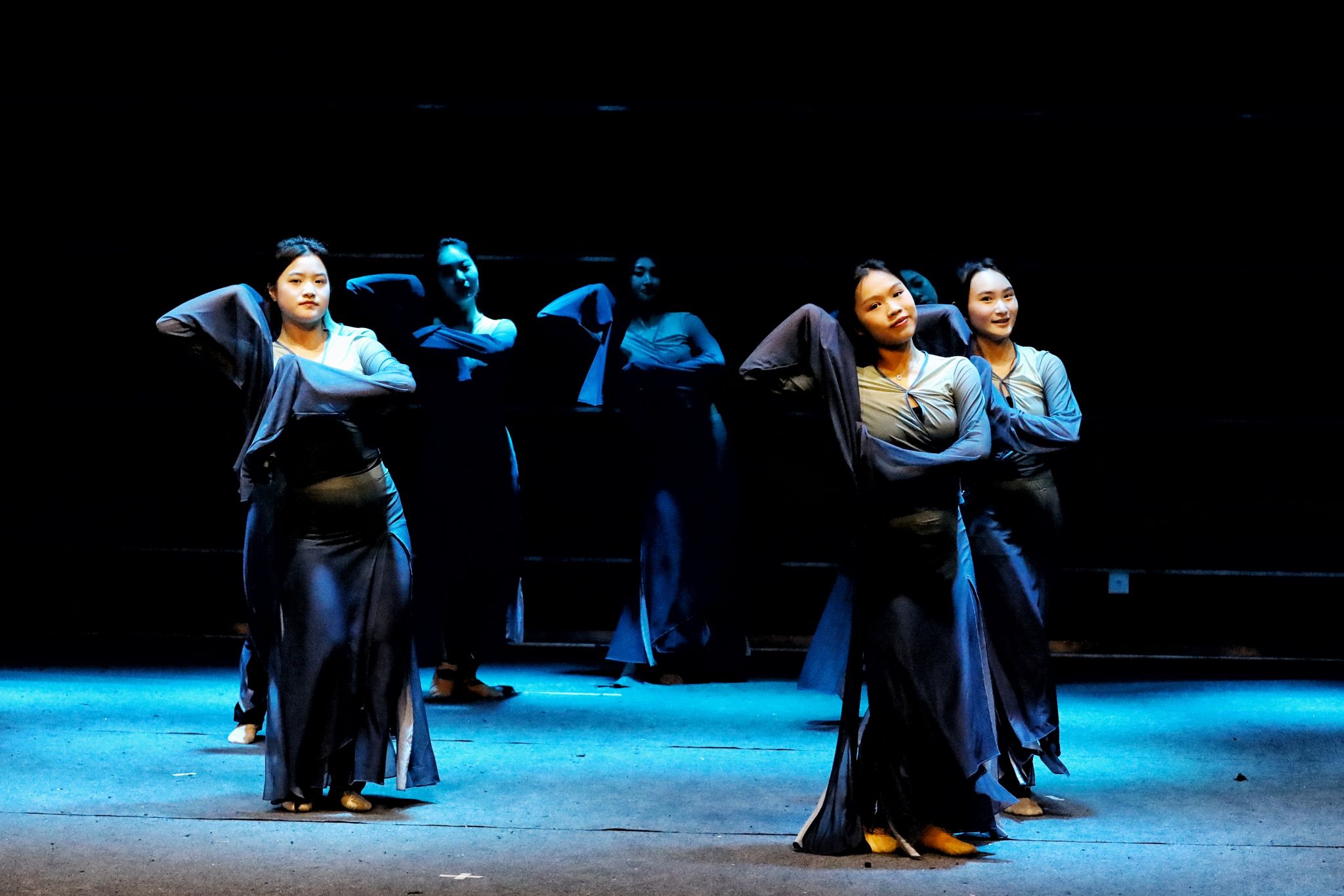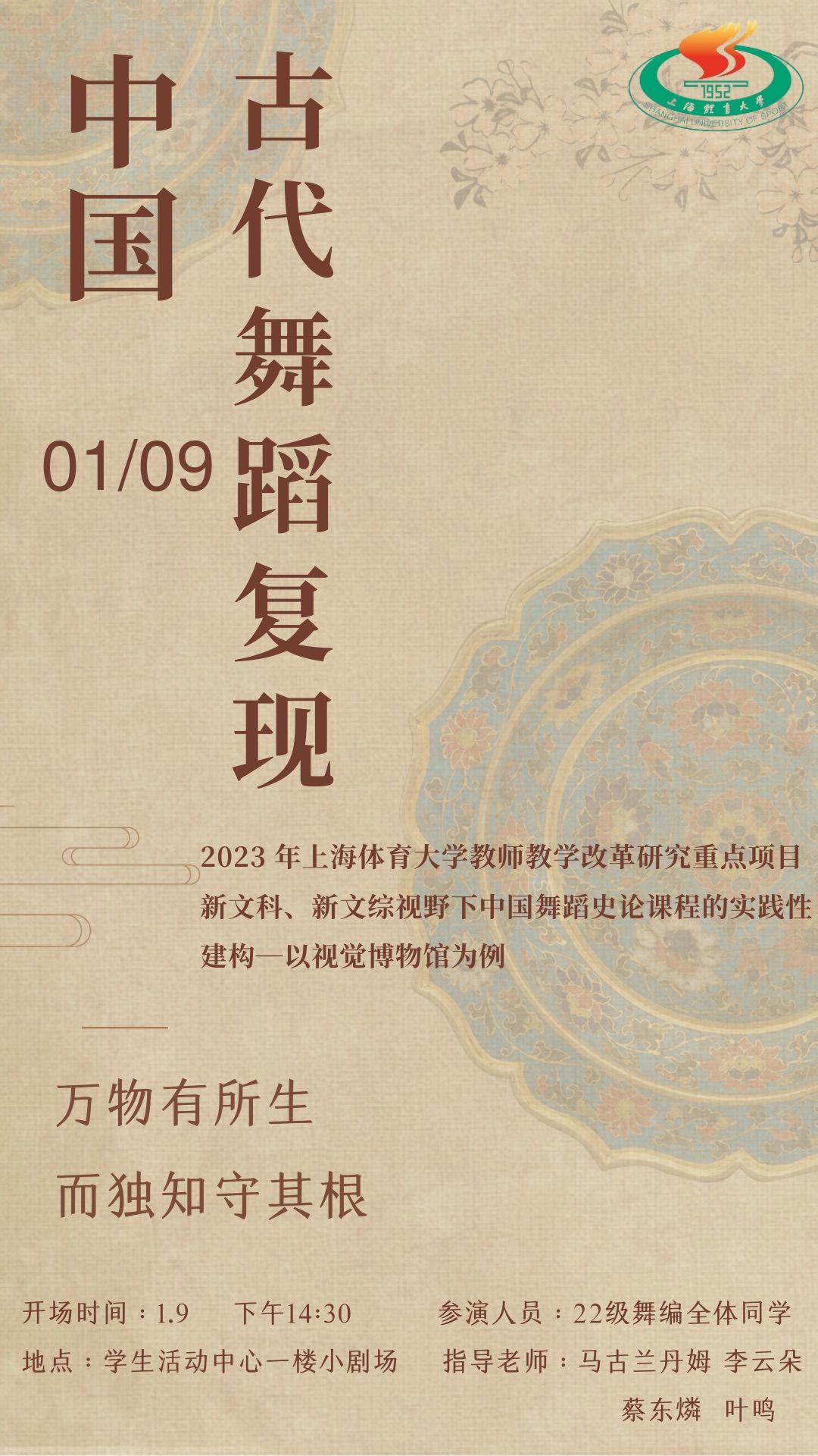 2024年1月9日,402永利集团舞蹈编导专业举办“万物有所生,而独知守其根”中国古代舞蹈复现汇报展示,以查阅文献、绘画、石刻、雕塑等相关材料为方法,以中国古代舞蹈的表演形式、风格特征、文化内涵等信息记载与描绘为依据,以中国古代部分典型舞蹈样式复现创作为主题,最终呈现出有史可寻、有据可依的十二个从西周到唐代的古代舞蹈作品。
