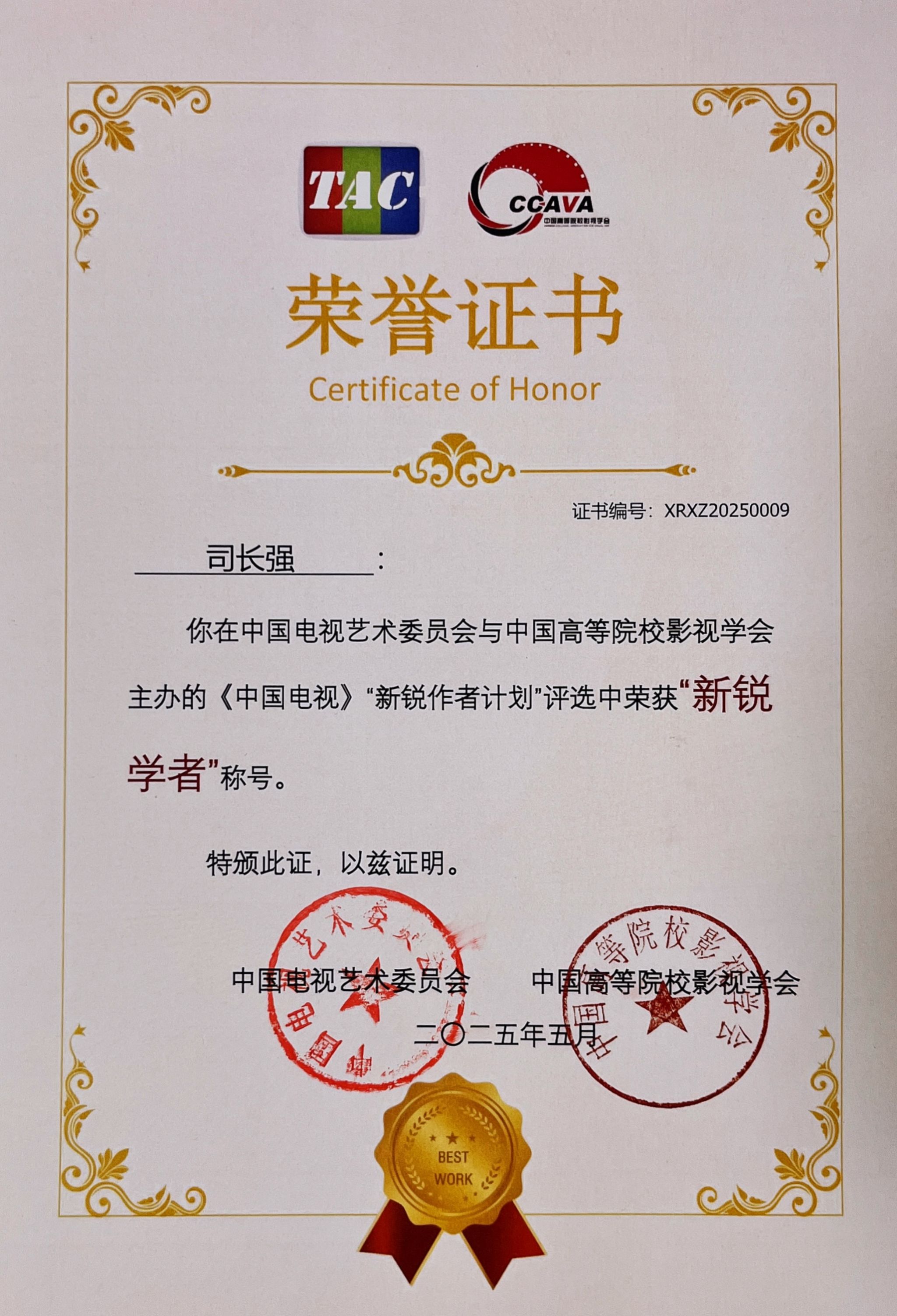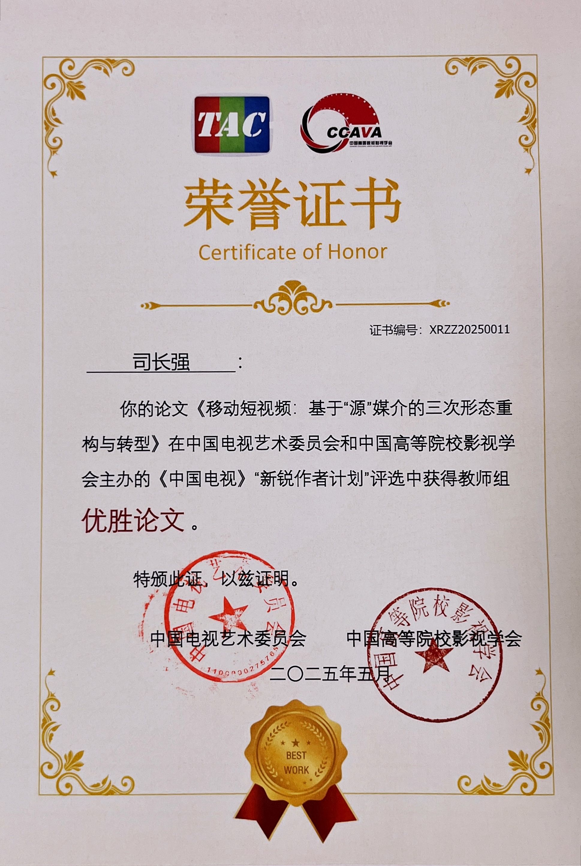 5月15—18日,由国家广电总局中国电视艺术委员会和中国高等院校影视学会共同主办的“《中国电视》新锐作者计划”发布交流会在甘肃兰州举行。公司402永利集团青年教师司长强副教授荣获“新锐学者”称号(最高奖项),其参选论文《移动短视频:基于“源”媒介的三次形态重构与转型》获“优胜论文”奖。