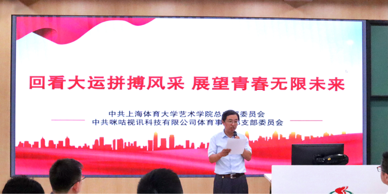 咪咕视讯体育事业部总监,党支部书记缪杰代表中国移动咪咕公司对上体在大运会的赛事转播,传播及其相关活动中给予的大力支持和配合予以诚挚的感谢。对于上体学子在本次大运会中勤奋好学的精神、积极主动的投入以及有理想,敢担当,能吃苦,敢奋斗的青春风貌给予了极大的肯定。同时也提出展望,希望同学们可以在回望与反思中明确目标与方向,展现青春的无限风采;希望未来咪咕公司可以与上体不断加深合作,共同以体育的力量凝聚爱国情怀,振奋民族精神,落实二十大加快建设体育强国的要求。